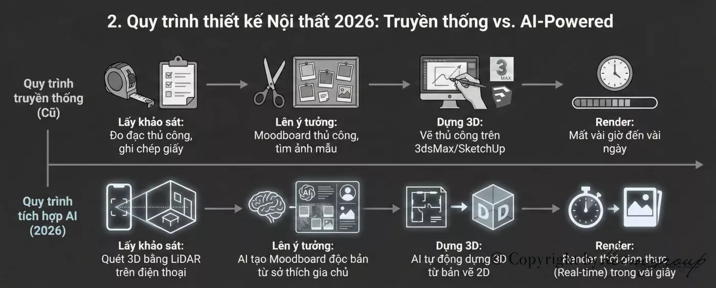 2. Quy trình thiết kế Nội thất 2026: Truyền thống vs. AI-Powered