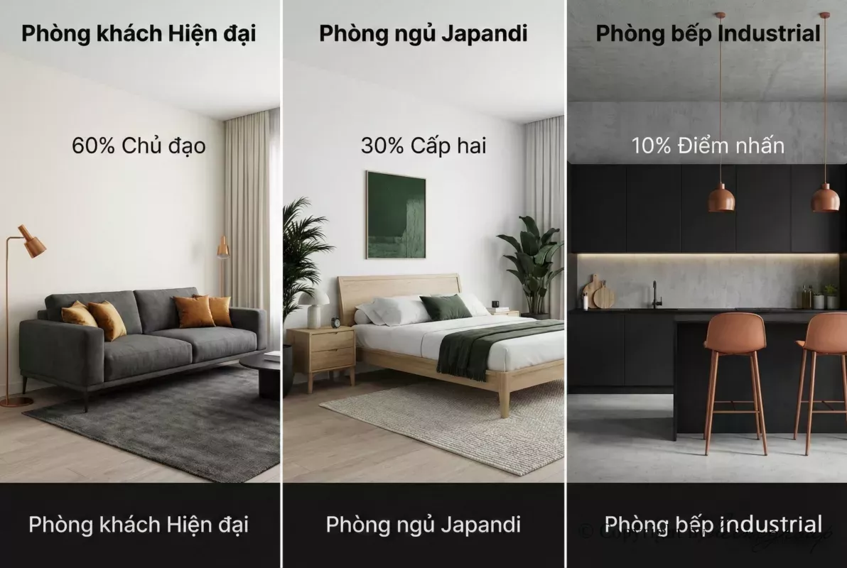 Đây là một nguyên tắc trang trí giúp tạo ra sự cân bằng về thị giác. Theo đó, trong một không gian, màu sắc nên được phân bổ theo tỷ lệ phần trăm như sau: