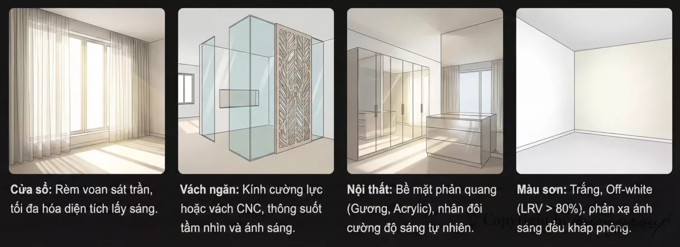 Trong thiết kế nội thất căn hộ nhỏ, ánh sáng tự nhiên không chỉ là yếu tố thẩm mỹ mà còn là “liều thuốc” giúp nới rộng không gian và cải thiện sức khỏe tinh thần. Dưới đây là những giải pháp kỹ thuật giúp bạn tận dụng tối đa nguồn sáng quý giá này.