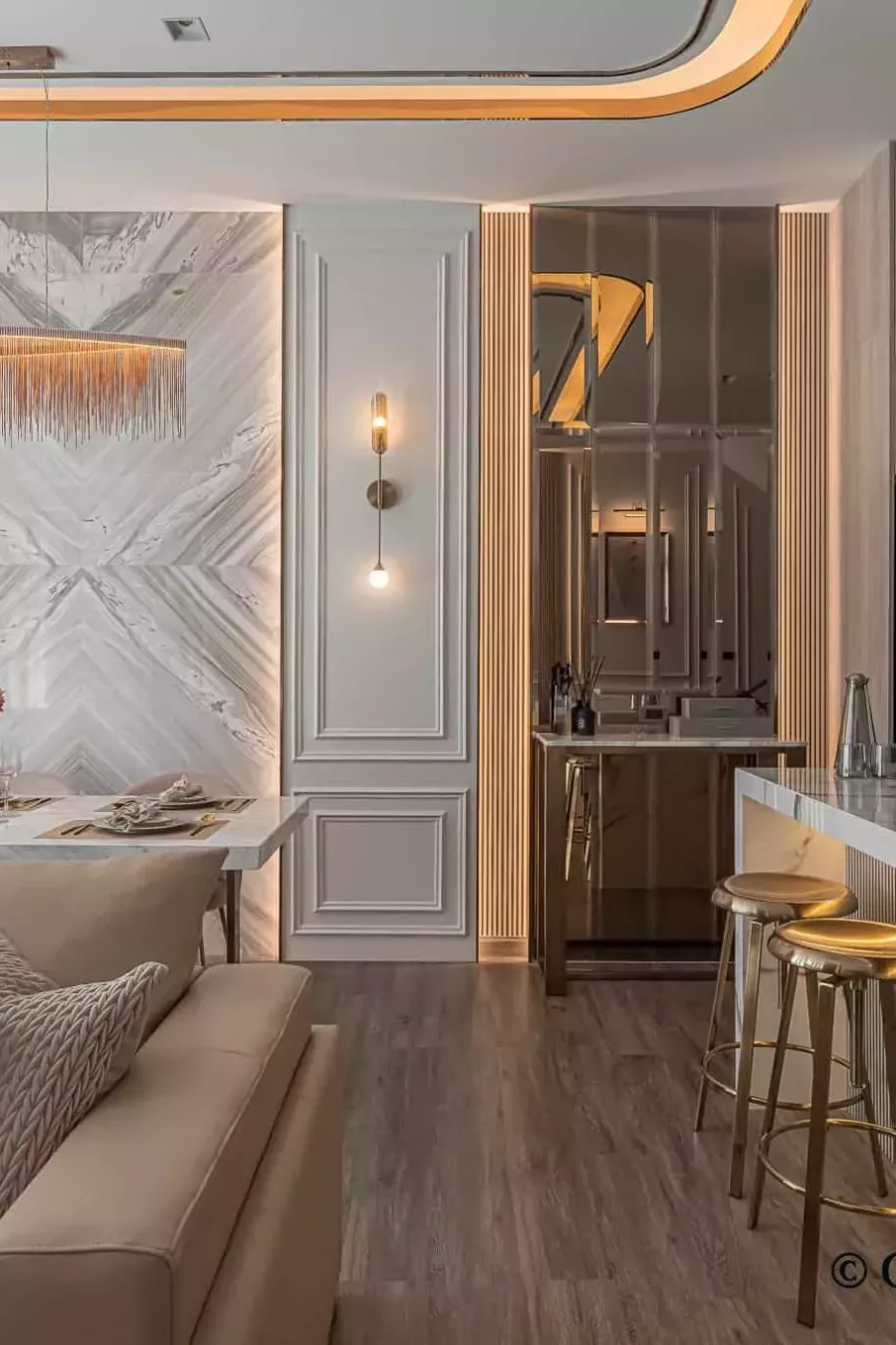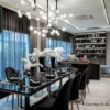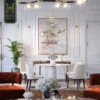 Toàn bộ không gian phòng khách được làm mới với gam màu tối chủ đạo, bề mặt đá tự nhiên khổ lớn, hệ chiếu sáng âm tường tinh tế và nội thất da nâu caramel cao cấp. Các điểm nhấn như tượng decor trừu tượng, tranh nghệ thuật đương đại và hệ đèn trần vòng tròn tạo nên sự kịch tính thị giác, nhưng vẫn giữ được cảm giác ấm cúng và riêng tư cho gia chủ.